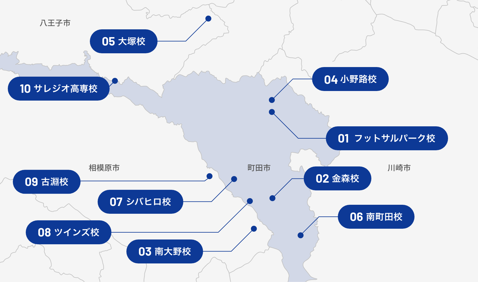 スクールのご紹介 フットサルパーク校 所在地:町田市小野路町1701 アクセス 鶴川駅・多摩センター駅から鶴32系統「五反田」バス停下車1分 鶴川駅⇒五反田(約12分) 神奈川中央交通HP 多摩センター駅⇒五反田(約18分) 神奈川中央交通HP 聖蹟桜ヶ丘駅⇒五反田(約31分) 神奈川中央交通HP 駐車場⇒施設内に無料駐車場有 スケジュール スタンダードクラス 曜日対象時間月会費空き状況体験申込 月年長・1・2年生15:20~16:20¥6,240〇申し込む 2・3・4・5・6年 16:30 ~ 17:40¥6,740△(残りわずか)申し込む 木園児15:00~16:00¥6,240○申し込む 年長・1・2・3年16:10~17:20¥6,740〇申し込む 3・4・5・6年17:25~18:45¥7,340〇申し込む アドヴァンスクラス 曜日対象時間月会費空き状況体験申込 金2・3・4年16:30~17:50¥7,340〇申し込む 4・5・6年18:00~19:30¥8,340〇申し込む 土曜クラス 曜日対象時間月会費空き状況体験申込 土園児10:20~11:10¥3、640×(満員キャンセル待ち)キャンセル待ち申込 1・2年11:30~12:40¥3,640×(満員キャンセル待ち)キャンセル待ち申込 女の子クラス 曜日対象時間月会費空き状況体験申込 月1~6年生17:50~19:00¥5,240○申し込む 金森校 所在地:町田市金森東1-17-1 アクセス 町田駅より徒歩25分 町田駅から町田バスセンター(徒歩4分)⇒『金森郵便局』下車徒歩6分 町田バスセンター⇒金森郵便局 神奈川中央交通HP 成瀬駅より徒歩20分or成瀬駅⇒金森郵便局下車徒歩6分 駐車場⇒施設内に無料駐車場有 スケジュール スタンダードクラス 曜日対象時間月会費空き状況体験申込 火年長・1・2・3年17:30 ~18:40¥6,740△(残りわずか)申し込む 3・4・5・6年18:40 ~20:00¥7,340○申し込む 水年長・1・2・3年17:30~18:40¥6,740〇申し込む 3・4・5・6年18:40 ~20:00¥7,340○申し込む 南大野校 所在地:相模原市南区上鶴間1-3-1 アクセス 相模大野駅徒歩13分or相模大野駅南口⇒新町中学校入口下車徒歩6分 駐車場⇒施設に駐車場はございません。近隣のコインパーキングをご利用ください。 スケジュール スタンダードクラス 曜日対象時間月会費空き状況体験申込 金年少・年中(在園生のみ)14:15~15:15¥6,040△(残りわずか)申し込む 年長(在園生のみ)・1年15:30~16:30¥6,040△(残りわずか)申し込む 1・2・3・4年16:40~17:50¥6,840△(残りわずか)申し込む 小野路校 所在地:町田市小野路2023-1 アクセス 鶴川駅・多摩センター駅から小野路経由多摩センター駅行「下堤」下車徒歩2分 鶴川駅⇒下堤(約11分) 神奈川中央交通HP 多摩センター駅⇒下堤(19分) 神奈川中央交通HP 駐車場⇒施設内に駐車場有(平日無料) スケジュール スペシャルクラス(セレクションクラス) 曜日クラス時間定員月会費空き状況 月スペシャルU-9/U-1017:25 ~ 18:55-¥8,340- スペシャルU-11/U-1217:25 ~ 18:55-¥8,340- チャレンジクラス(セレクションクラス) 曜日クラス時間定員月会費空き状況 月チャレンジ1・2年16:10 ~ 17:20-¥7,340- GKクラス 曜日対象時間定員月会費空き状況体験申込 月基礎クラス(4・5・6年)16:50 ~ 17:4016名¥6,240○申し込む 専門クラス(4・5・6年)17:45 ~ 18:5516名¥7,340〇体験は基礎クラスからになります。 大塚校 所在地:東京都八王子市大塚220 アクセス 多摩モノレール 大塚・帝京大学駅徒歩13分 京王線 聖蹟桜ヶ丘駅から 約15分乗車、「帝京大学入口」下車、徒歩 約5分 京王線 高幡不動駅から「百草団地入口経由 帝京大学構内行き」約10分乗車、終点下車、徒歩 約8分 京王相模原線・小田急多摩線 多摩センター駅から「帝京大学構内行き」約15分乗車、終点下車、徒歩 約8分 駐車場⇒施設内に無料駐車場有 スケジュール アドヴァンスクラス 曜日対象時間月会費空き状況体験申込 月2・3・4年16:30~17:50¥7,340○申し込む 4・5・6年17:55~19:25¥8,340△(残りわずか)申し込む 南町田校 所在地:東京都町田市鶴間3-1-1 アクセス 駐車場⇒施設に駐車場有(有料) スケジュール スペシャルクラス(セレクションクラス) 曜日対象時間定員月会費空き状況 火U-11・U-1217:25~18:55-¥8,340- 金U-9・U-1017:25~18:55-¥8,340- チャレンジクラス(セレクションクラス) 曜日クラス時間定員月会費空き状況 金チャレンジ1・2年16:10 ~ 17:20-¥7,340- アドヴァンスクラス 曜日クラス時間月会費空き状況体験申込 火1・2・3年16:10 ~ 17:20¥7,340△(残りわずか)申し込む 4・5年16:20 ~ 17:40¥7,340〇申し込む 水2・3・4年16:00 ~ 17:20¥7,340〇申し込む 5・6年17:25 ~ 18:55¥8,340△(残りわずか)申し込む シバヒロ校 所在地:町田市中町1-20-23 アクセス 駐車場⇒施設に駐車場はございません。近隣のコインパーキングをご利用ください。 スケジュール 土曜コース 曜日対象時間月会費空き状況体験申込 土年少・年中9:25~10:15¥3,640×(満員キャンセル待ち)キャンセル待ち申込 年長・1年9:25~10:25¥3,640×(満員キャンセル待ち)キャンセル待ち申込 年中・年長10:40~11:40¥3,640×(満員キャンセル待ち)キャンセル待ち申込 1・2年10:30~11:40¥3,640×(満員キャンセル待ち)キャンセル待ち申込 町田東急ツインズ校 所在地:東京都町田市原町田6-4-1 東急ツインズEAST館屋上 アクセス 小田急線町田駅、JR横浜線町田駅より徒歩1分 北口駅前広場の目の前の『町田東急ツインズEAST館』屋上 スケジュール スタン