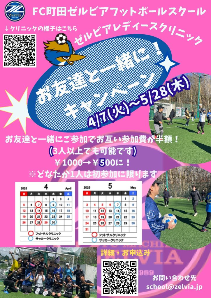 2025.03.02 お知らせフットボールレディース 〝お友達と一緒に〟キャンペーン実施!【ゼルビアレディースクリニック】参加者募集中! 4月・5月を対象に、ゼルビアレディースクリニック〝お友達と一緒に〟キャンペーンを実施いたします!通常はお1人様1000円の参加費が、お友達と一緒にご参加いただくと、お2人ともお1人様500円となります。是非この機会にお友達をお誘いの上、ご参加ください! 【ゼルビアレディースサッカー・フットサルクリニック】とは…日頃の運動不足・ストレスの解消をしたい方、フットサル・サッカーが好き、これから始めてみたい方のためのクリニックです!まずは、ウォーキングやストレッチ、ゲーム性のあるウォーミングアップから始め、パスやシュートなどの基本的な練習を行います。ボールを蹴ったことがない、運動が得意ではない方でも大歓迎です!楽しく一緒に体を動かしましょう! 両クリニックとも初めてご参加される方からも好評いただいており笑い声の絶えないクリニックとなっております!是非一度お越しください★レディースクリニックの様子はこちらこちらをクリック!★ 【火曜日:レディースフットサルクリニック】◇開催日◇毎週火曜日◇時間◇10:30-12:00 【木曜日:レディースサッカークリニック】◇開催日◇毎週木曜日◇時間◇10:30-12:00 ※サッカークリニックとフットサルクリニックの違いは、使用するボールが異なることです。クリニックの流れに大きく変わりはありません。 【雨天時の開催有無】※小雨決行。悪天候による中止の場合は当日9:30までに当ホームページのにてお知らせさせていただきます。 ◇場所◇ゼルビアフットサルパーク ※無料駐車場あり ◇対象◇女性の方🌸ママさん世代の方に多くご参加をいただいています🌸🌸初心者の方・運動が苦手な方も大歓迎🌸※小学生以下の方はご参加できません。 ◇参加費◇¥1,000円(保険料込み)*費用は当日、会場で現金またはPaypayにてお支払いください。 ◇持ち物◇運動のできる服装、飲み物 ※スパイク不可。トレーニングシューズ、運動靴でお願い致します。 ◇担当コーチ◇【火曜日:レディースフットサルクリニック】小杉賢三、他1名※変更の可能性あり。 【木曜日:レディースサッカークリニック】林玲花、他1名※変更の可能性あり。 ◇参加申込方法◇下記、申込フォームよりお申込みください。https://forms.gle/3jzMF1Cpn7s9cDjX9 ※5日を過ぎてもメールが届かない場合は、お手数ですがメールにて下記までお問合せください。 ◇2026年度レディースクリニック開催日◇ 【お問い合わせ】FC町田ゼルビアフットボールスクールレディースクリニック担当:林玲花《メール》school@zelvia.jp Instagramでこのプロフィールを見る FC町田ゼルビアフットボールスクール(@zelvia_football_school) • Instagram写真と動画