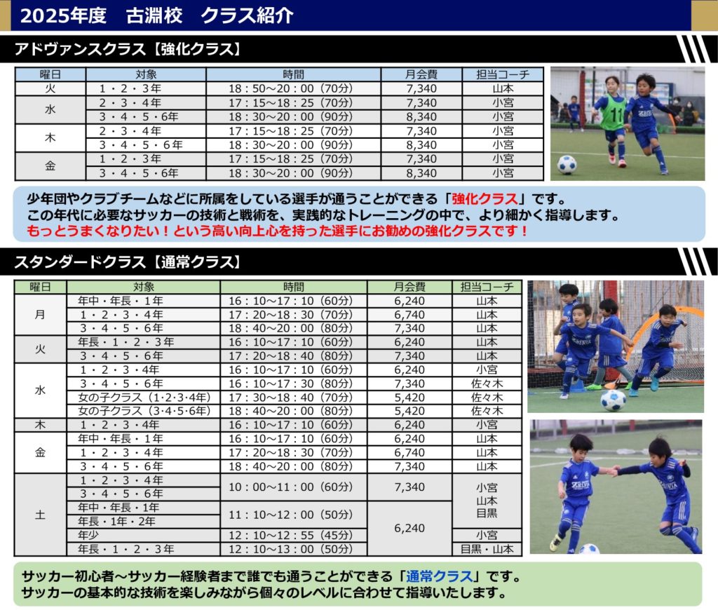 2025.10.27 お知らせスクールフットボール 【古淵校 】『スクール無料体験』~申込受付中~ 古淵校では随時、スクール無料体験を受付けておりますので、まずは是非、スクール無料体験にて古淵校へのご参加をお待ちしております。 【スクール無料体験のメリット】 無料体験では普段のスクールに参加をしますので、普段の練習の内容やスクールの雰囲気などを知ることができます! また、担当コーチとも直接話ができますので気になることなどをご相談いただけます。 【古淵校の特徴】 ★古淵校は月曜日から土曜日まで毎日スクールを開催しており、対象学年も年中~小学6年生までと対象が幅広いので選べる選択肢が多いです。 ★上級者目指す選手向け強化クラスの『アドヴァンスクラス』と、誰でも楽しくサッカーを学べる『スタンダードクラス』がありますのでお子様のニーズに合わせてクラス選べます! 【2025年度 古淵校クラス紹介】 【古淵校コーチングスタッフ】 【古淵校・2025年 年間トレーニング計画】 ■アドヴァンスクラス 年間トレーニング計画はこちら ■スタンダードクラス 年間トレーニング計画はこちら 【スクール会場紹介】 【古淵校・スクール開催日】 【他のクラス・他の曜日も体験が可能です】 複数の曜日や、クラスで迷っている方や、ご検討をしたいという方は、無料体験が2回可能となっておりますので申込時に2つの曜日やクラス選択してください。 ※同じクラスを2回体験することはできません。 【古淵校・スクール無料体験の申込はこちら】 下記、URLよりお申込みください。 https://forms.gle/JZYAt7iBNyChQHNS8 【定員について】 各クラスには定員がございます。 申込のタイミングによっては満員のお知らせをさせていただく場合もございますのでご了承ください。 【体験時の持物】 サッカーの出来る服装(自由)、シューズ(スパイク不可)、飲み物 ※ボールはこちらで用意していますので必要ございません。 【雨天時の開催状況の確認について】 雨天時の開催有無は、開始2時間前に決定し、町田ゼルビアスポーツクラブのホームページにてお知らせいたします。 こちらから個別に中止の連絡はいたしませんので、必ず各ご家庭で開催有無のご確認をお願いいたします。 雨天中止になった場合は、再度、別日に無料体験の参加可能です。 【FC町田ゼルビアフットボールスクール公式SNS】 《Instagramはこちら》 https://www.instagram.com/zelvia_football_school?igsh=MThxbWFuNXN1OXk4aw%3D%3D&utm_source=qr 《Xはこちら》 https://x.com/zelvia_school?s=21&t=ztbkvg0Ckdjrbs-D7HNEZQ 【お問合わせ】 FC町田ゼルビアフットボールスクール フットボールスクールサブダイレクター兼 古淵校 担当:小宮 佳孝(school@zelvia.jp)