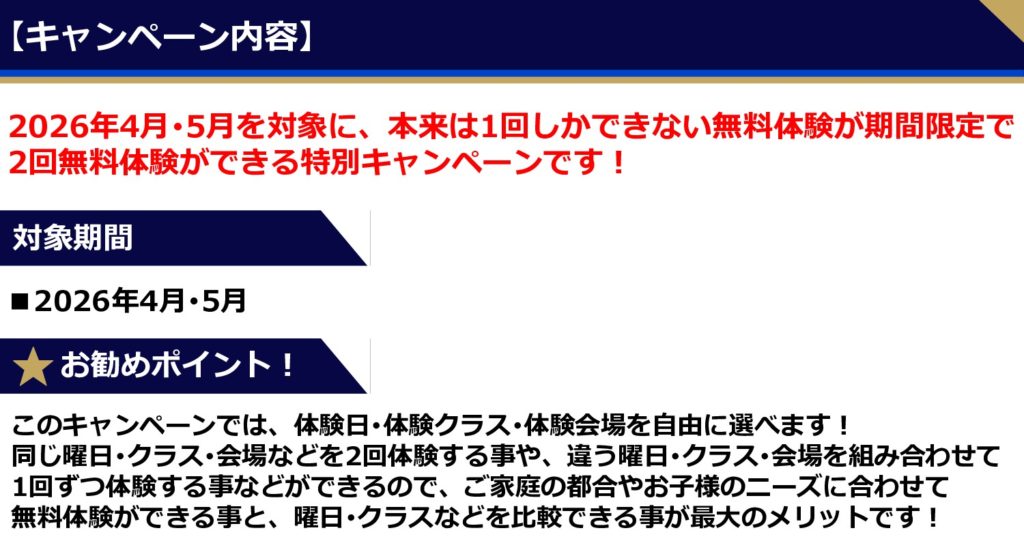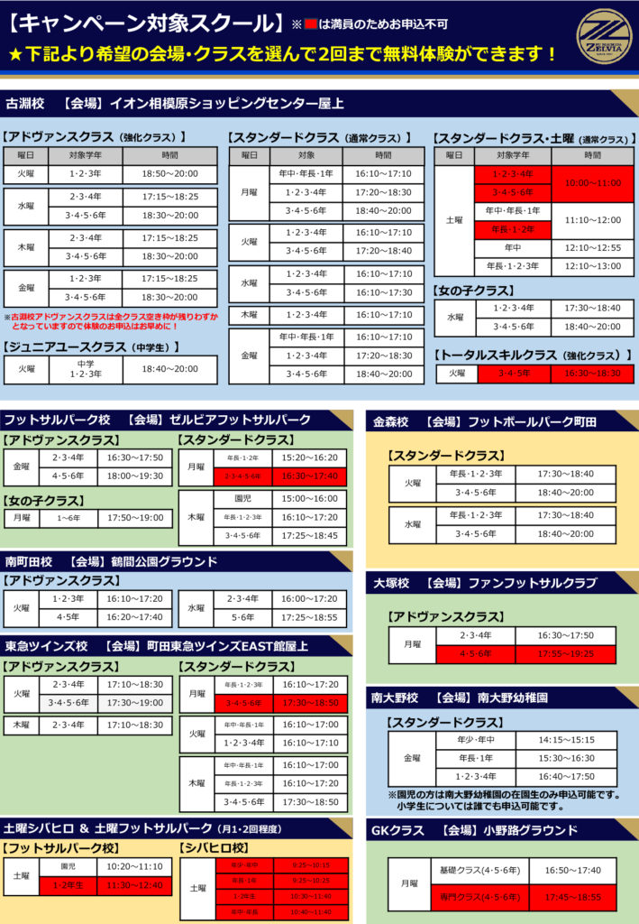 2026.03.01 お知らせスクールフットボール 【春のスペシャル企画 / 第1弾 】『無料体験2回キャンペーン』実施中! この春はゼルビアのスクールを体験してみよう⚽🌸2026年4月・5月を対象にゼルビアのスクールを無料で2回体験ができる『無料体験2回キャンペーン』を実施中!また、スクールにご入会の方には、adidas製サッカーボールをプレゼントいたします!⚽サッカースクールをお探しの方や、ゼルビアのスクールにご興味がある方はこの機会をお見逃しなく! 【申込フォーム】https://forms.gle/d7rmqfSj8MtNA8dG9■申込後、スタッフよりメールにて申込完了の返信をさせていただきます。 【お問合わせ】FC町田ゼルビアフットボールスクールフットボールスクールサブダイレクター小宮 佳孝(school@zelvia.jp)